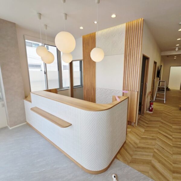 受付は不安や緊張を抱えながら来院された患者様が扉を開けて最初に目にするところです。少しでも安心を感じられるように温かく優しいデザインに仕上がったと思います。クリニック全体もあと少しで完成です。